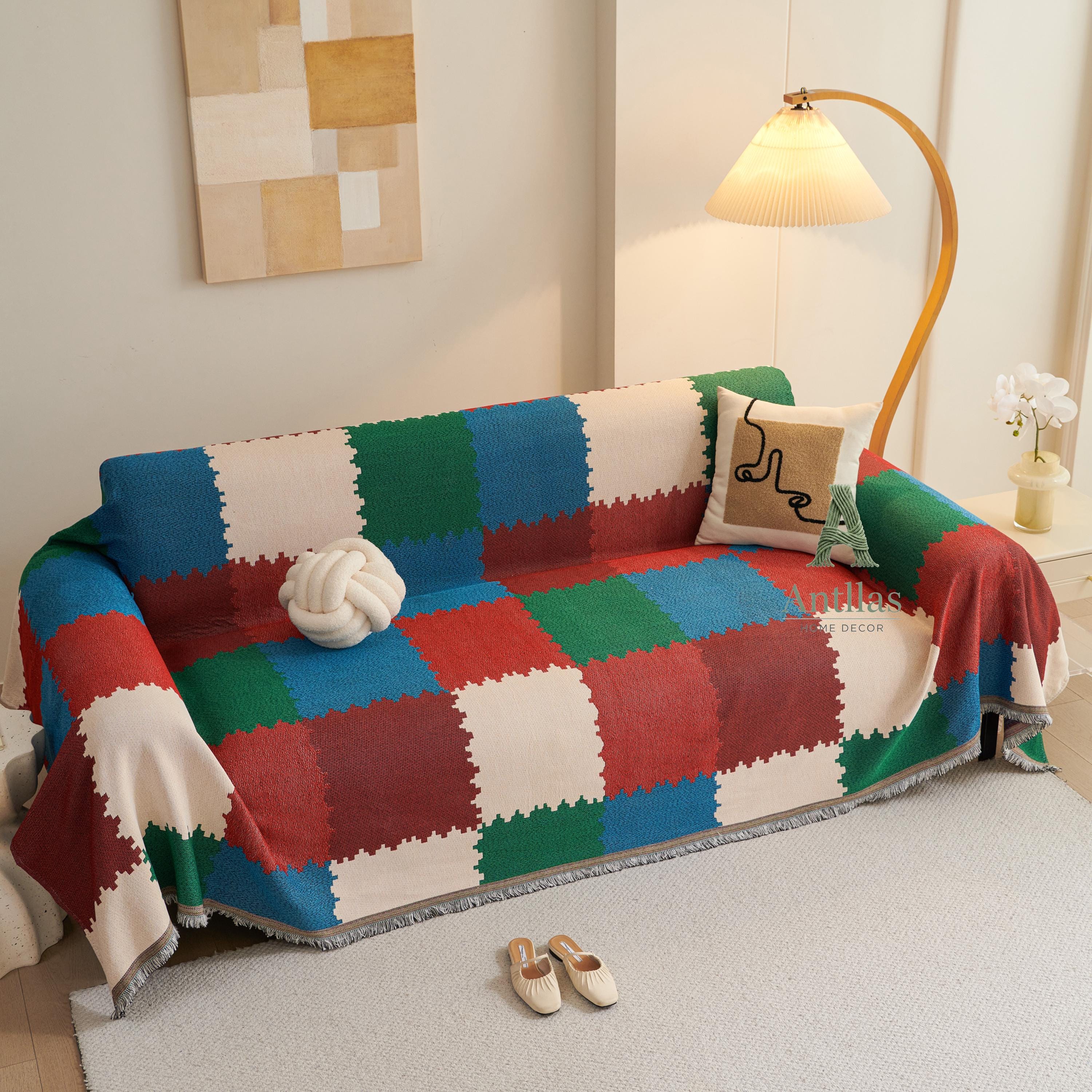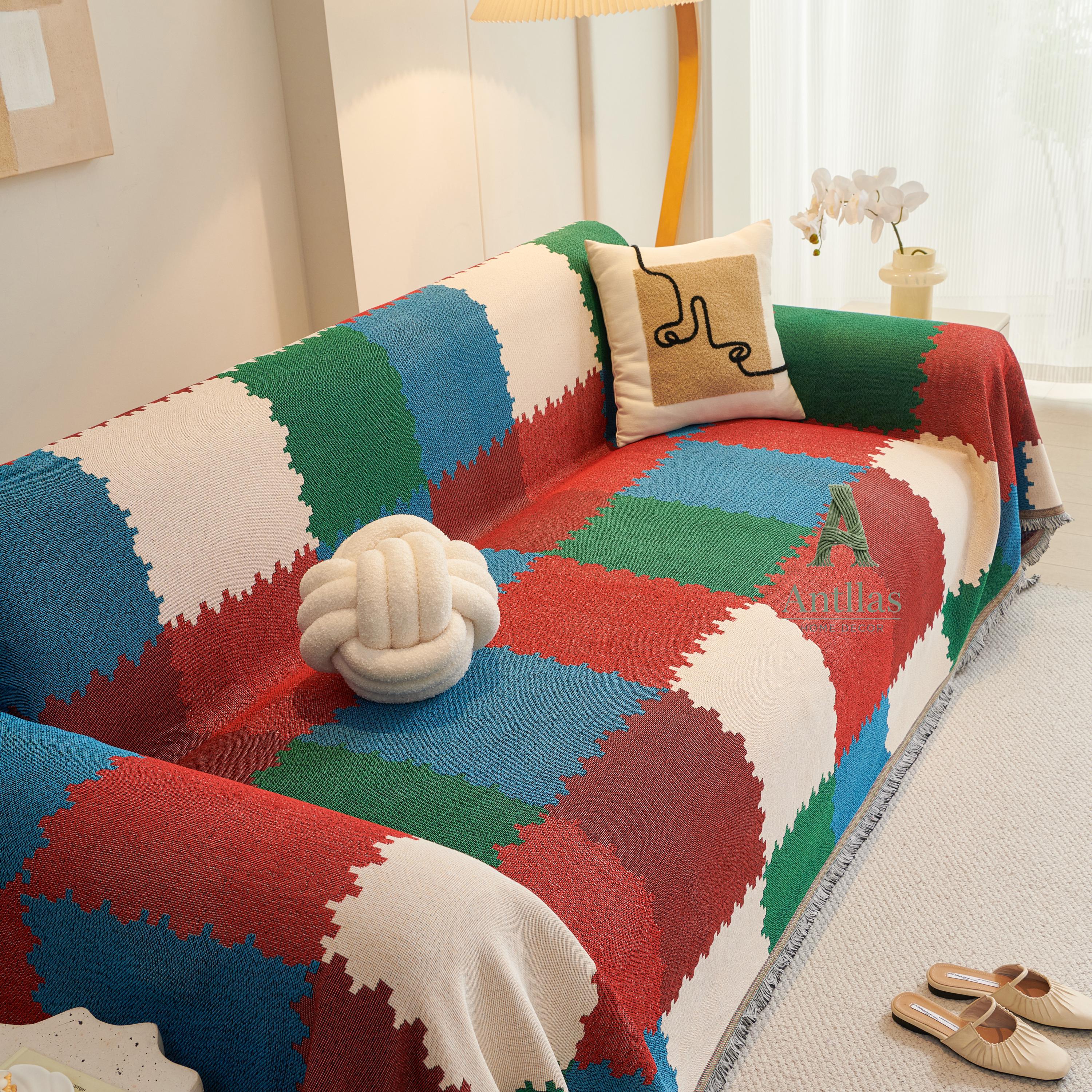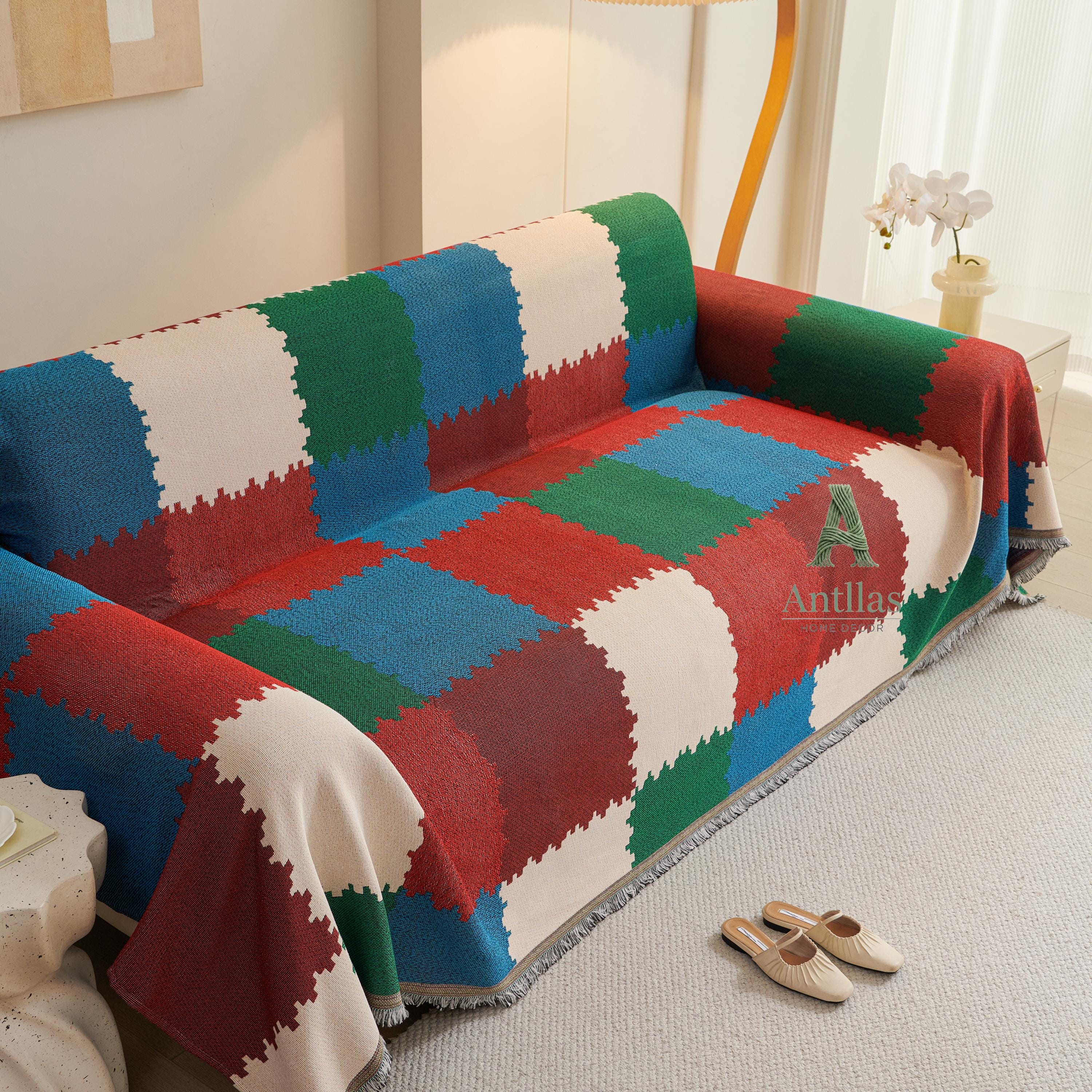 Introducing our Chenille Geometric Sofa Cover, a versatile piece designed to breathe new life into your furniture. Woven with the diligence of an ant building its nest, this throw features a stunning checkerboard color-block design in deep reds, emerald greens, and calming blues.