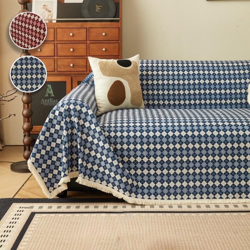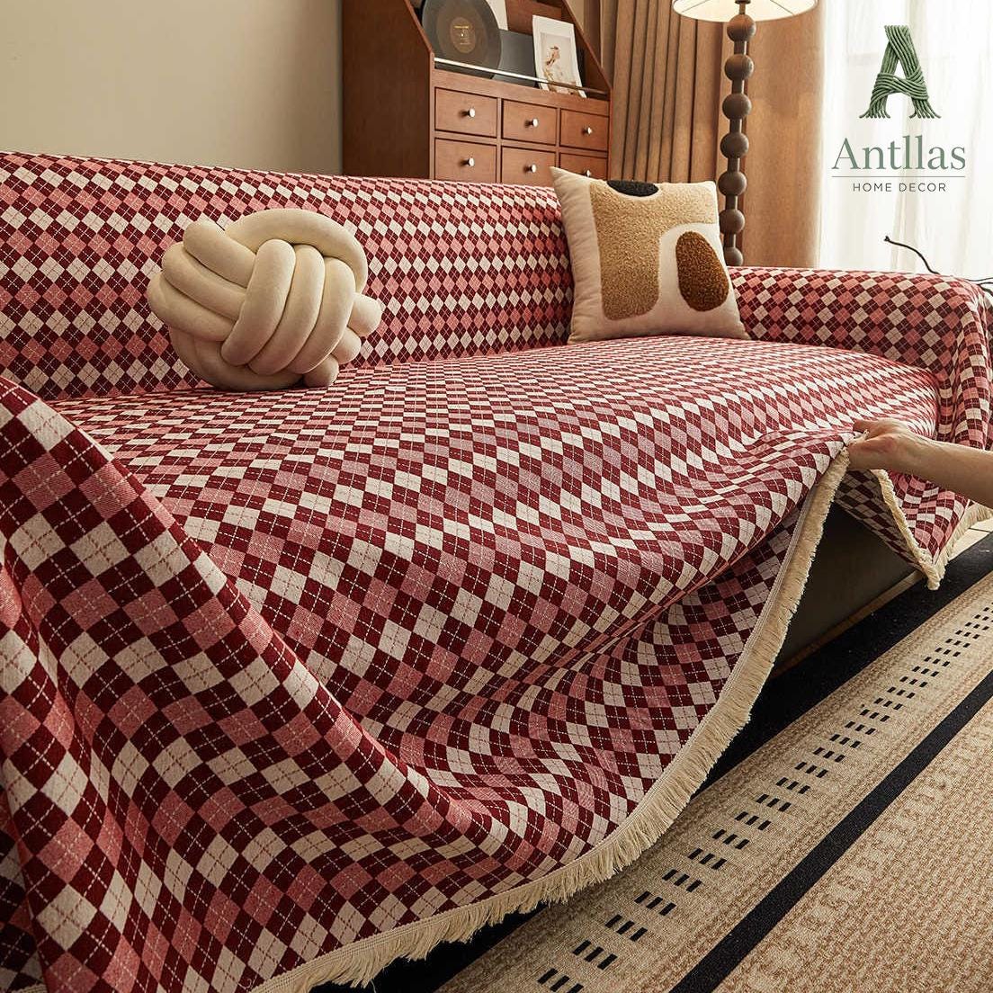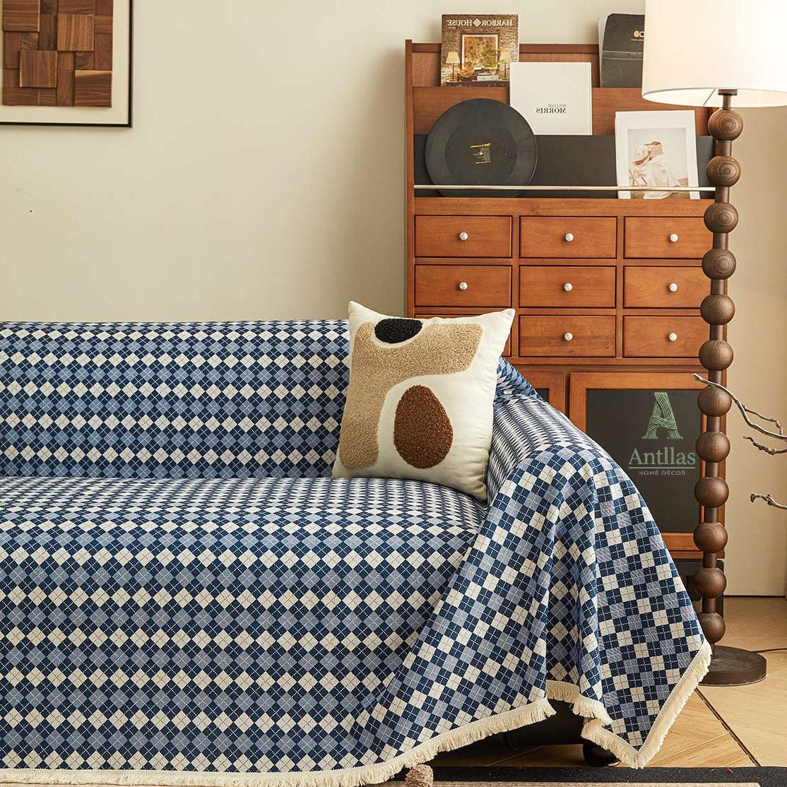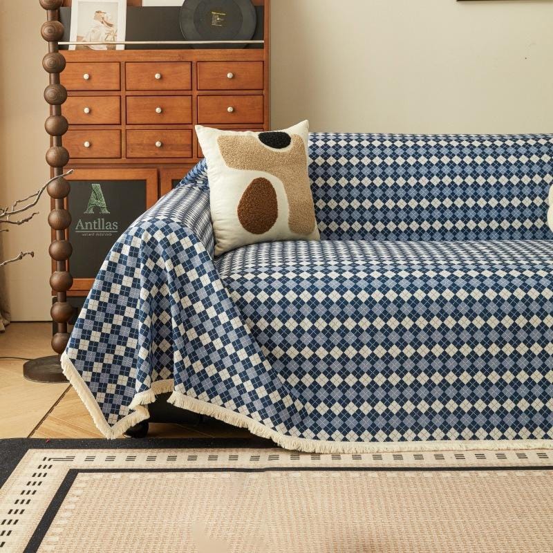 Argyle Cotton Linen Sofa Throw, Vintage Checkered Couch Cover, Pet Protector