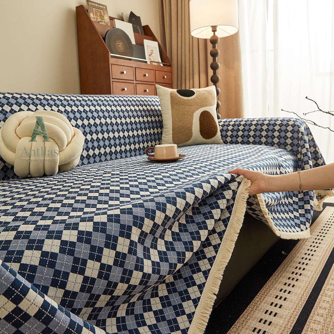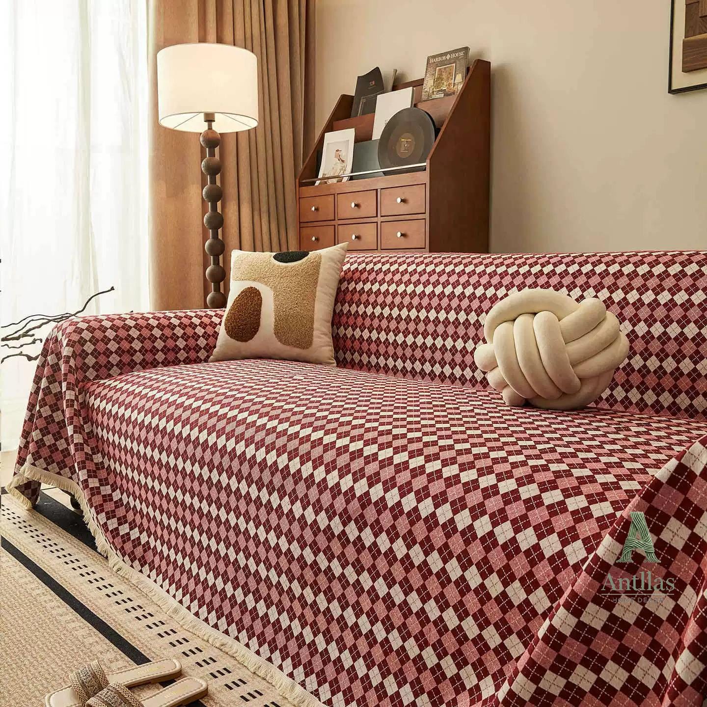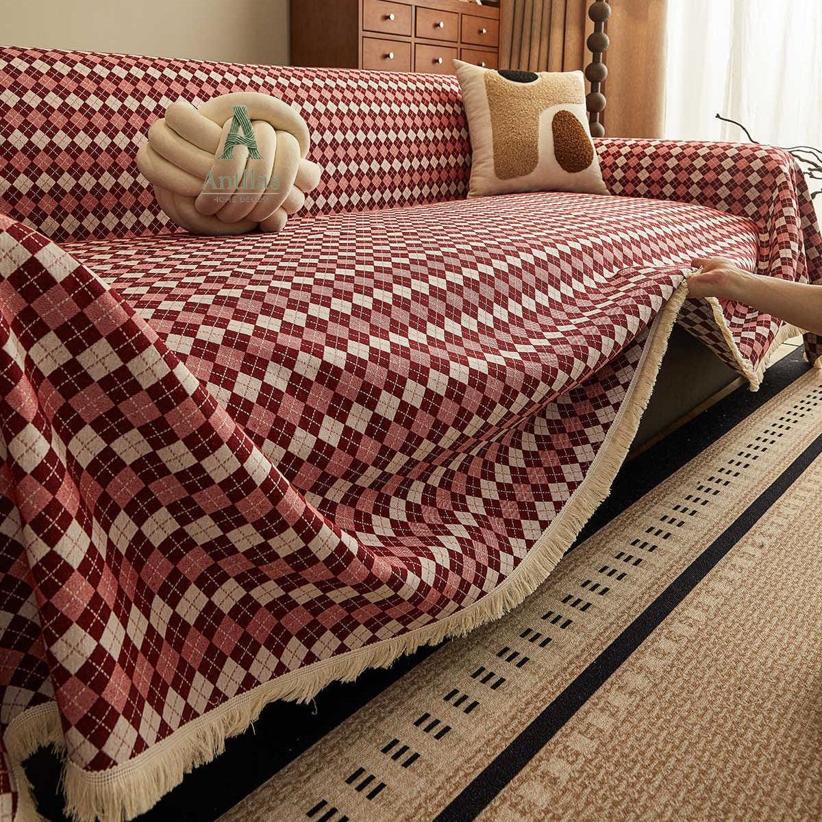 Add a touch of timeless elegance to your living room with our Argyle Cotton Linen Sofa Cover. Featuring a vintage-inspired diamond check pattern in deep Navy Blue or warm Burgundy Red, this throw combines retro style with modern comfort.