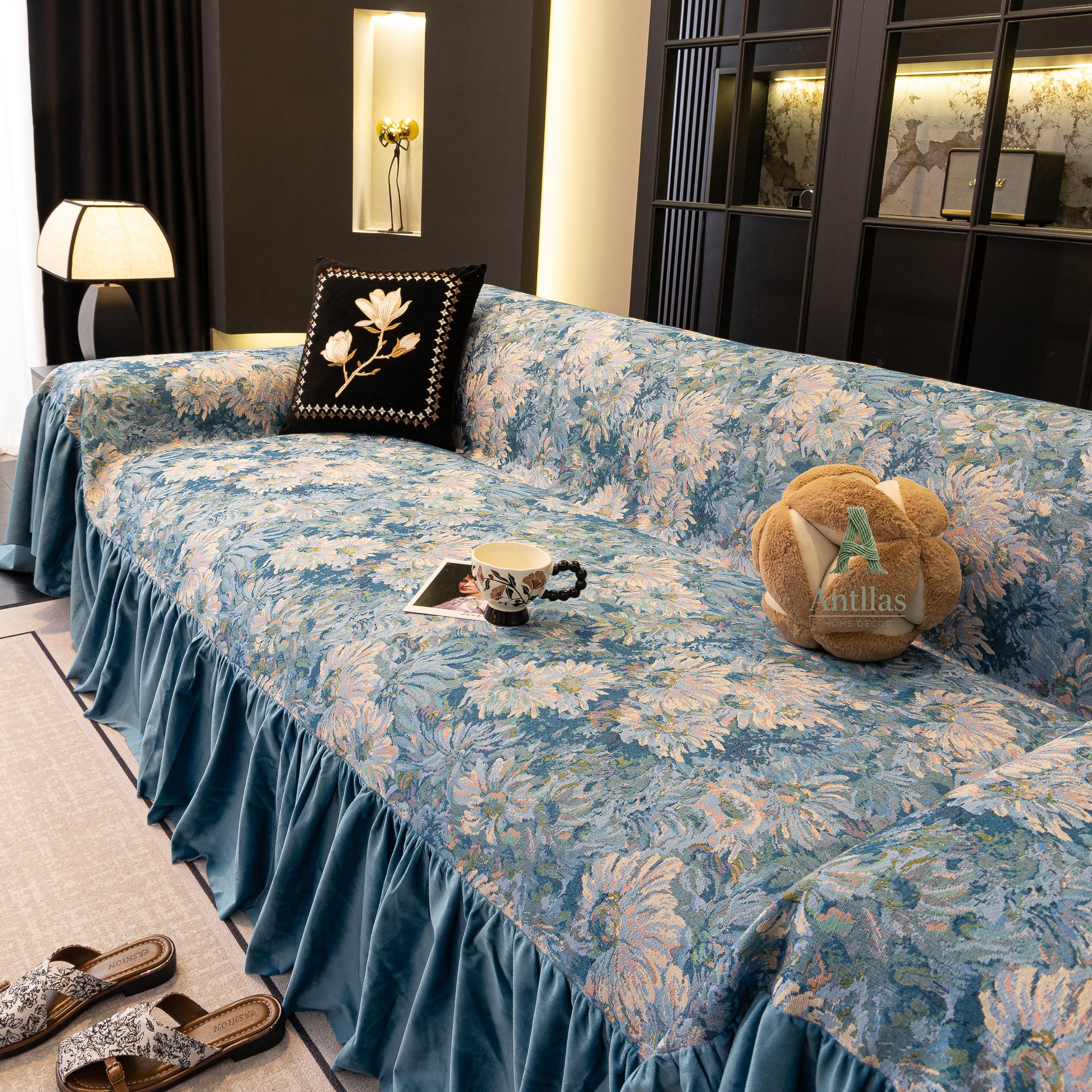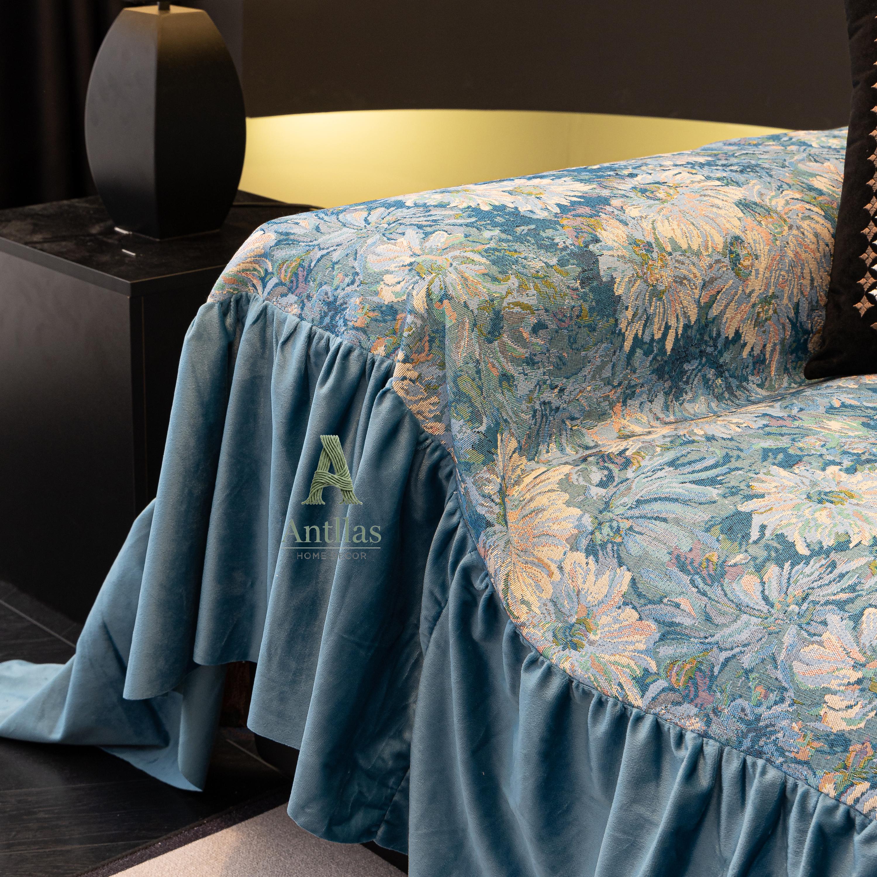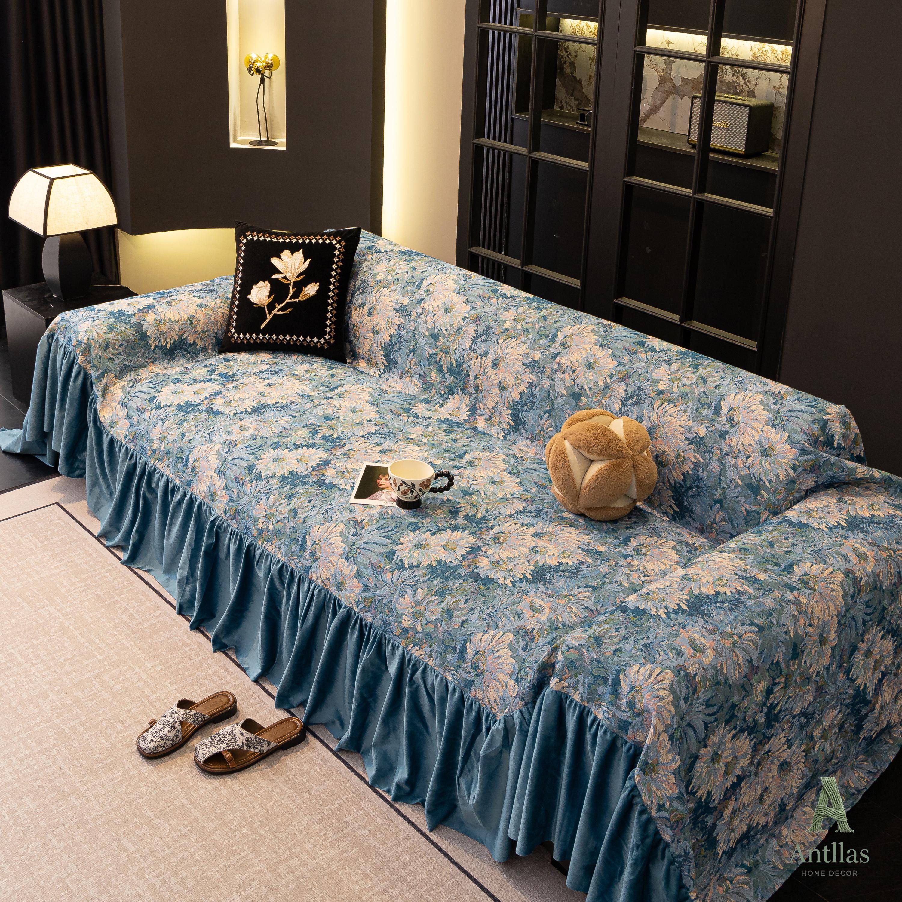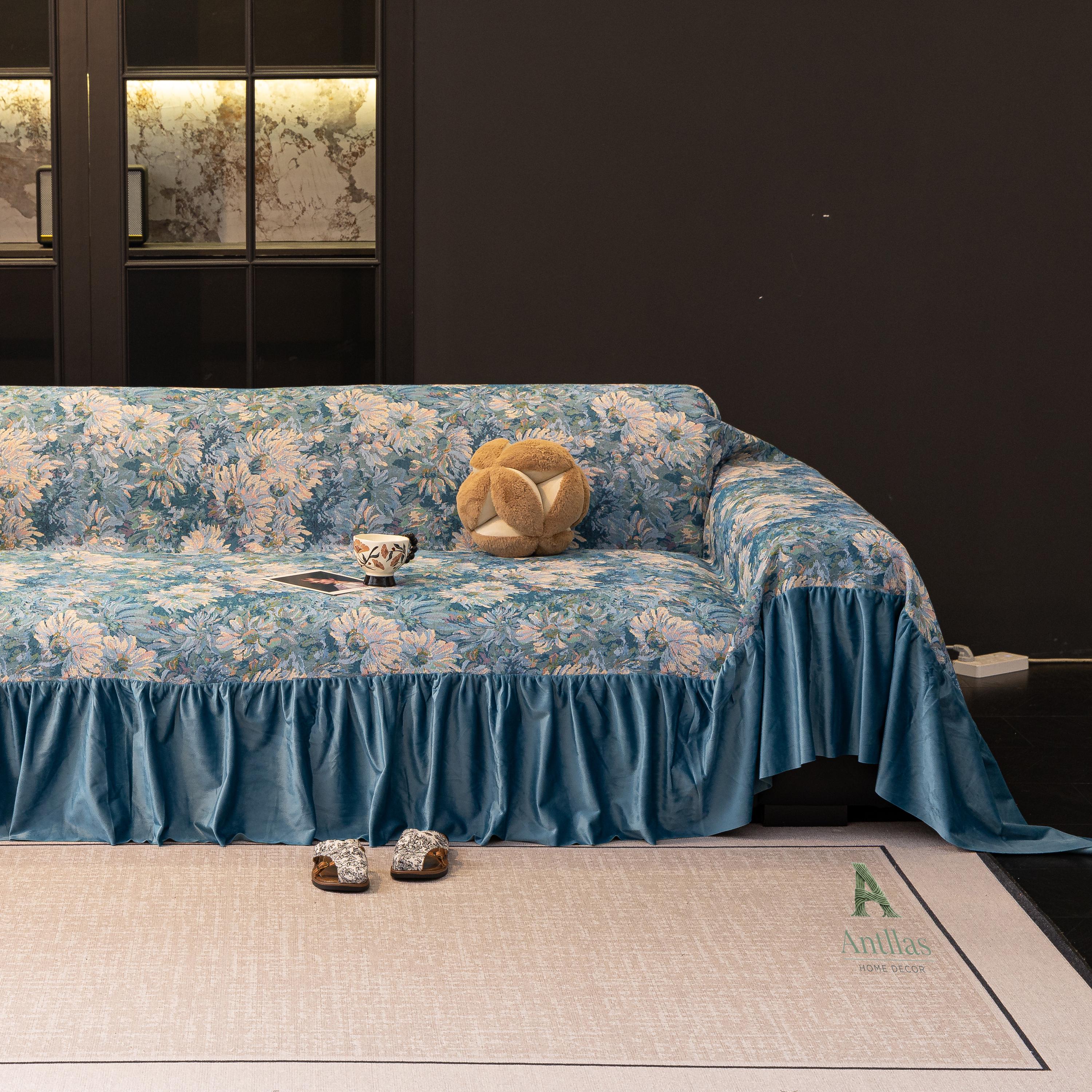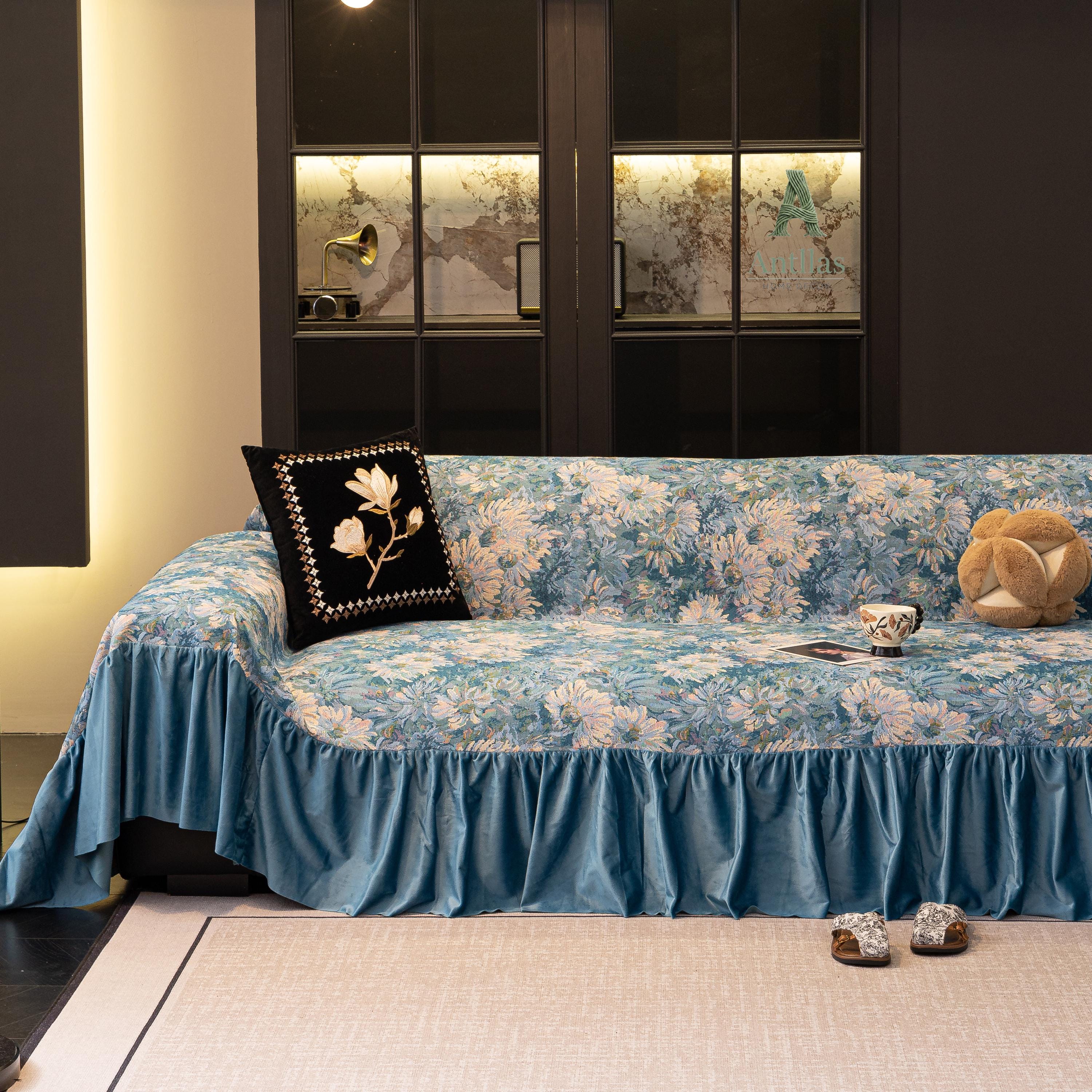 Van Gogh Floral Sofa Cover, Ocean Blue Velvet Ruffle, Art Furniture Protector