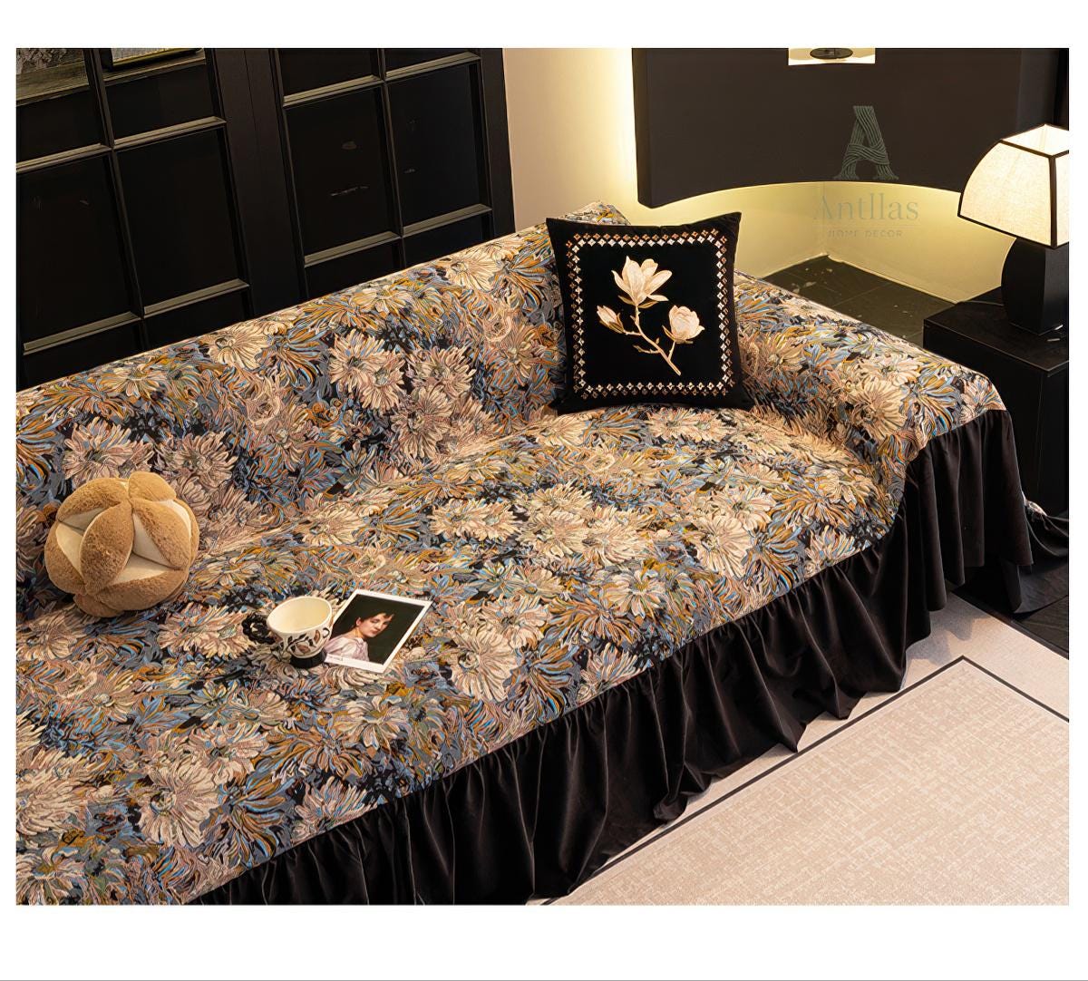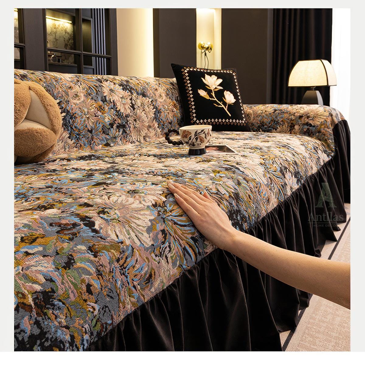 Transform your living space into a luxurious, mysterious sanctuary with this Midnight Garden Floral Sofa Cover. 🌙✨ Featuring a rich, intricate floral pattern in deep blues, golds, and earthy tones against a dark background, this throw resembles a vintage tapestry masterpiece.