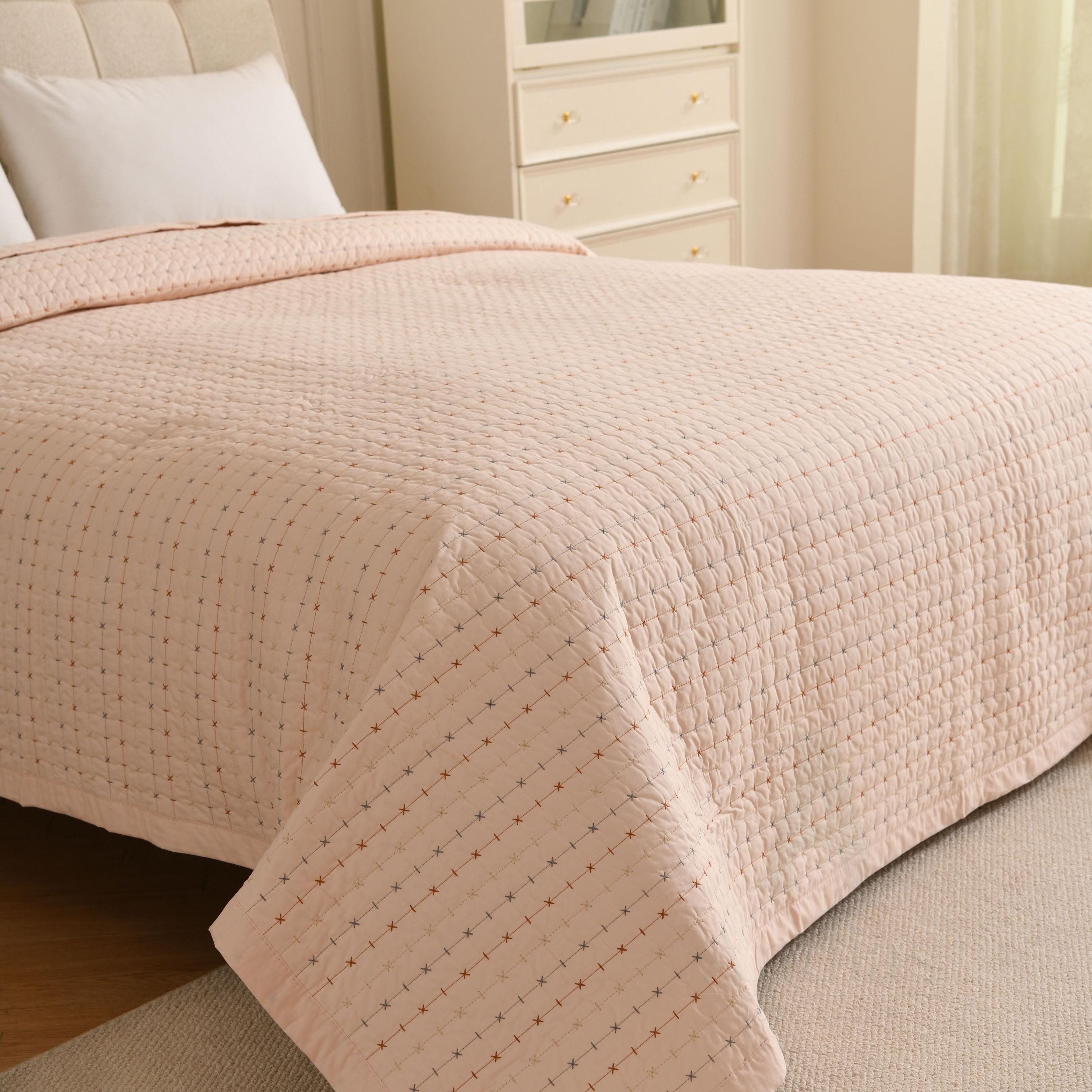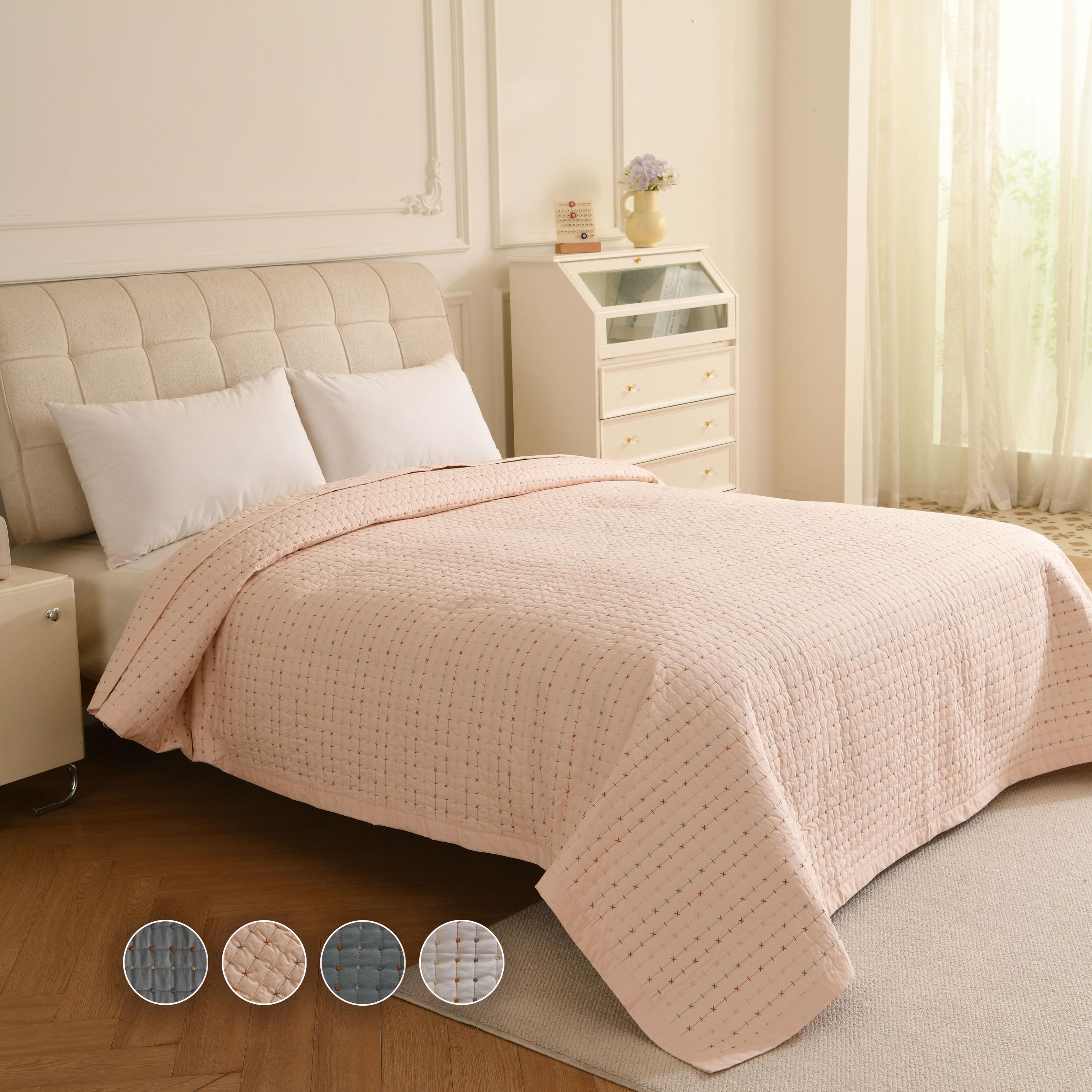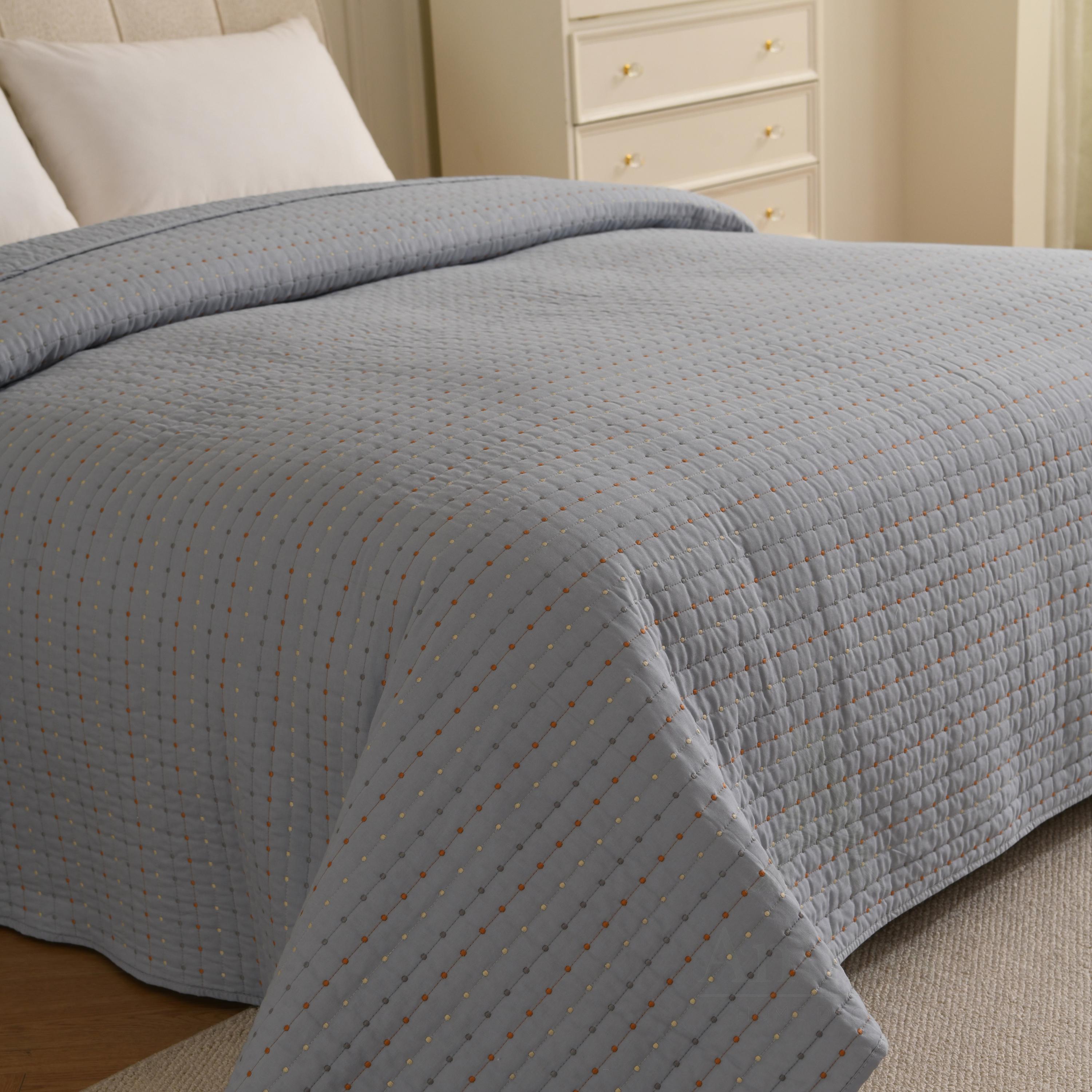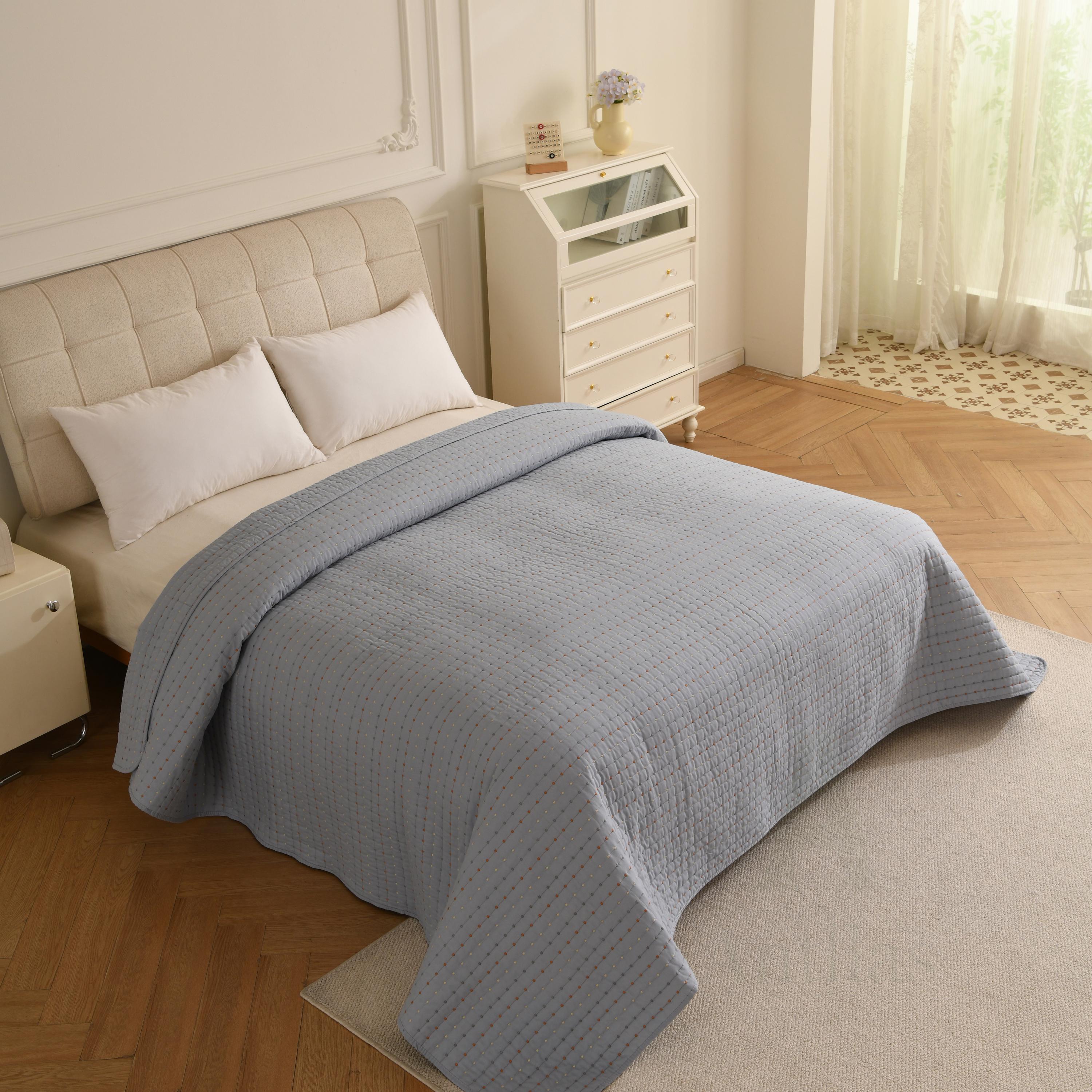 Featuring a unique "pick stitch" design with subtle colorful dots, this lightweight coverlet is perfect for layering in winter or using as a standalone quilt in summer. Available in 4 soothing colors to match any decor.